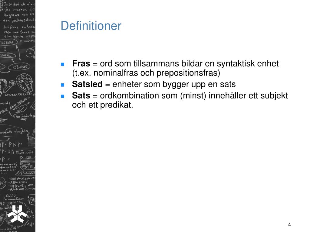 Definitioner • Fras = ord som tillsammans bildar en syntaktisk enhet (t.ex. nominalfras och prepositionsfras) • Satsled = enheter som bygger upp en sats • Sats = ordkombination som (minst) innehåller ett subjekt och ett predikat.