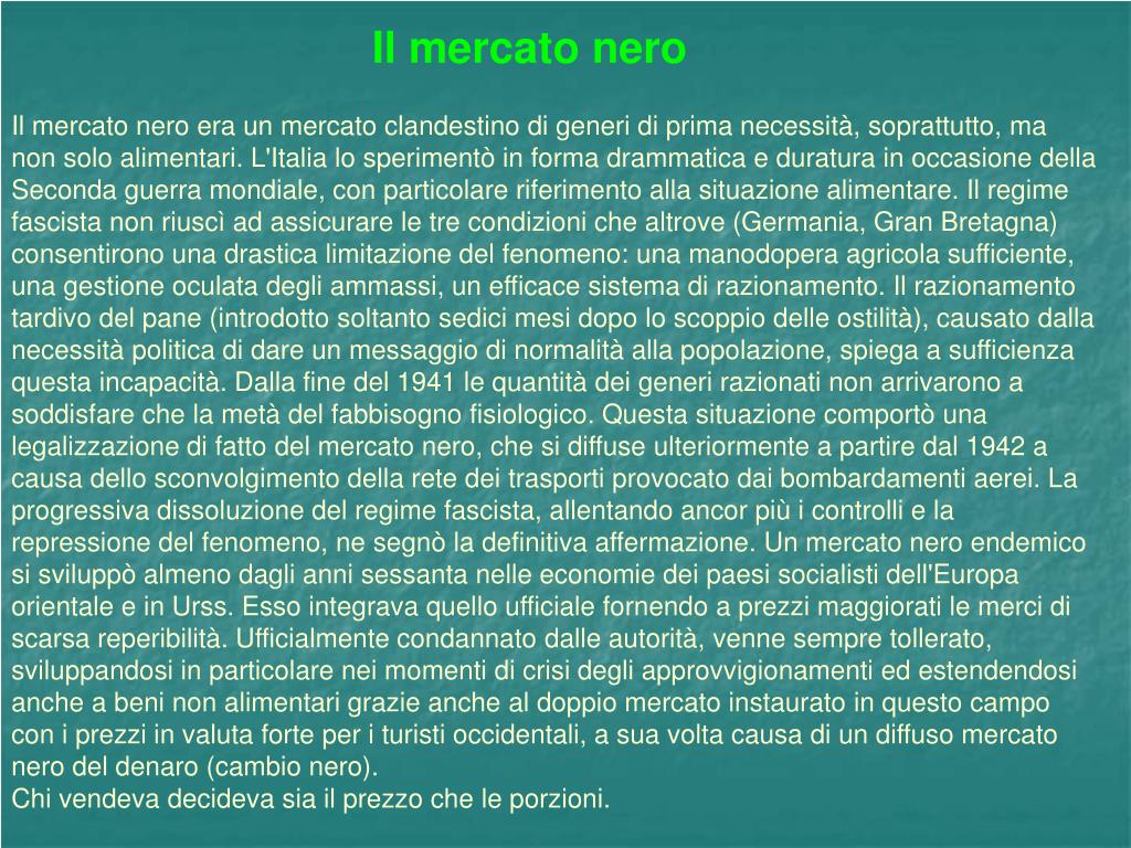 Il mercato nero Il mercato nero era un mercato clandestino di generi di prima necessità, soprattutto, ma non solo alimentari. L'Italia lo sperimentò in forma drammatica e duratura in occasione della Seconda guerra mondiale, con particolare riferimento alla situazione alimentare. Il regime fascista non riuscì ad assicurare le tre condizioni che altrove (Germania, Gran Bretagna) consentirono una drastica limitazione del fenomeno: una manodopera agricola sufficiente, una gestione oculata degli ammassi, un efficace sistema di razionamento. Il razionamento tardivo del pane (introdotto soltanto sedici mesi dopo lo scoppio delle ostilità), causato dalla necessità politica di dare un messaggio di normalità alla popolazione, spiega a sufficienza questa incapacità. Dalla fine del 1941 le quantità dei generi razionati non arrivarono a soddisfare che la metà del fabbisogno fisiologico. Questa situazione comportò una legalizzazione di fatto del mercato nero, che si diffuse ulteriormente a partire dal 1942 a causa dello sconvolgimento della rete dei trasporti provocato dai bombardamenti aerei. La progressiva dissoluzione del regime fascista, allentando ancor più i controlli e la repressione del fenomeno, ne segnò la definitiva affermazione. Un mercato nero endemico si sviluppò almeno dagli anni sessanta nelle economie dei paesi socialisti dell'Europa orientale e in Urss. Esso integrava quello ufficiale fornendo a prezzi maggiorati le merci di scarsa reperibilità. Ufficialmente condannato dalle autorità, venne sempre tollerato, sviluppandosi in particolare nei momenti di crisi degli approvvigionamenti ed estendendosi anche a beni non alimentari grazie anche al doppio mercato instaurato in questo campo con i prezzi in valuta forte per i turisti occidentali, a sua volta causa di un diffuso mercato nero del denaro (cambio nero). Chi vendeva decideva sia il prezzo che le porzioni.