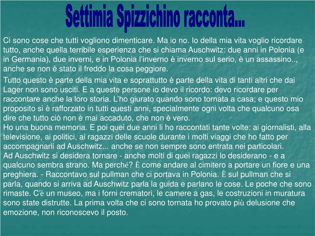 Settimia Spizzichino racconta... Ci sono cose che tutti vogliono dimenticare. Ma io no. Io della mia vita voglio ricordare tutto, anche quella terribile esperienza che si chiama Auschwitz: due anni in Polonia (e in Germania), due inverni, e in Polonia l’inverno è inverno sul serio, è un assassino.., anche se non è stato il freddo la cosa peggiore. Tutto questo è parte della mia vita e soprattutto è parte della vita di tanti altri che dai Lager non sono usciti. E a queste persone io devo il ricordo: devo ricordare per raccontare anche la loro storia. L’ho giurato quando sono tornata a casa; e questo mio proposito si è rafforzato in tutti questi anni, specialmente ogni volta che qualcuno osa dire che tutto ciò non è mai accaduto, che non è vero. Ho una buona memoria. E poi quei due anni li ho raccontati tante volte: ai giornalisti, alla televisione, ai politici, ai ragazzi delle scuole durante i molti viaggi che ho fatto per accompagnarli ad Auschwitz... anche se non sempre sono entrata nei particolari. Ad Auschwitz si desidera tornare - anche molti di quei ragazzi lo desiderano - e a qualcuno sembra strano. Ma perché? È come andare al cimitero a portare un fiore e una preghiera. - Raccontavo sul pullman che ci portava in Polonia. È sul pullman che si parla, quando si arriva ad Auschwitz parla la guida e parlano le cose. Le poche che sono rimaste. C’è un museo, ma i forni crematori, le camere a gas, le costruzioni in muratura sono state distrutte. La prima volta che ci sono tornata ho provato più delusione che emozione, non riconoscevo il posto.