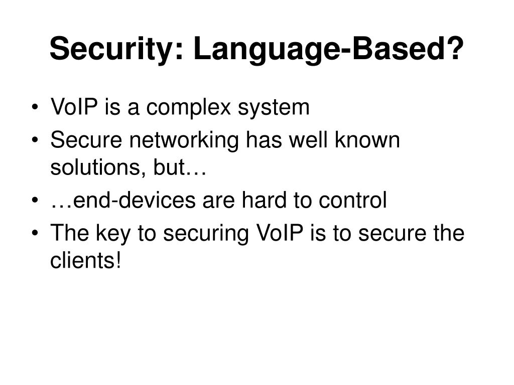 Security: Language-Based? • VoIP is a complex system • Secure networking has well known solutions, but… • …end-devices are hard to control • The key to securing VoIP is to secure the clients!