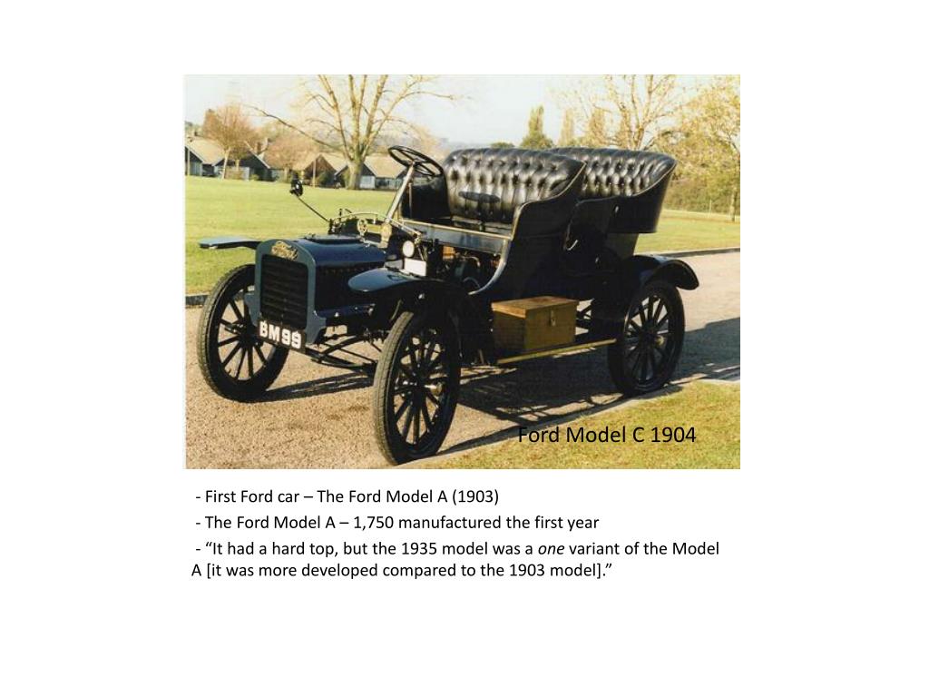 Ford Model C 1904 - First Ford car – The Ford Model A (1903) - The Ford Model A – 1,750 manufactured the first year - “It had a hard top, but the 1935 model was a one variant of the Model A [it was more developed compared to the 1903 model].”