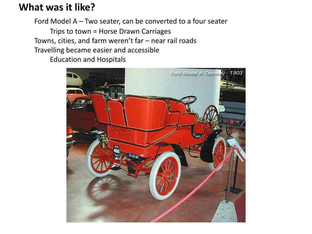 What was it like?Ford Model A – Two seater, can be converted to a four seater Trips to town = Horse Drawn Carriages Towns, cities, and farm weren’t far – near rail roads Travelling became easier and accessible Education and Hospitals