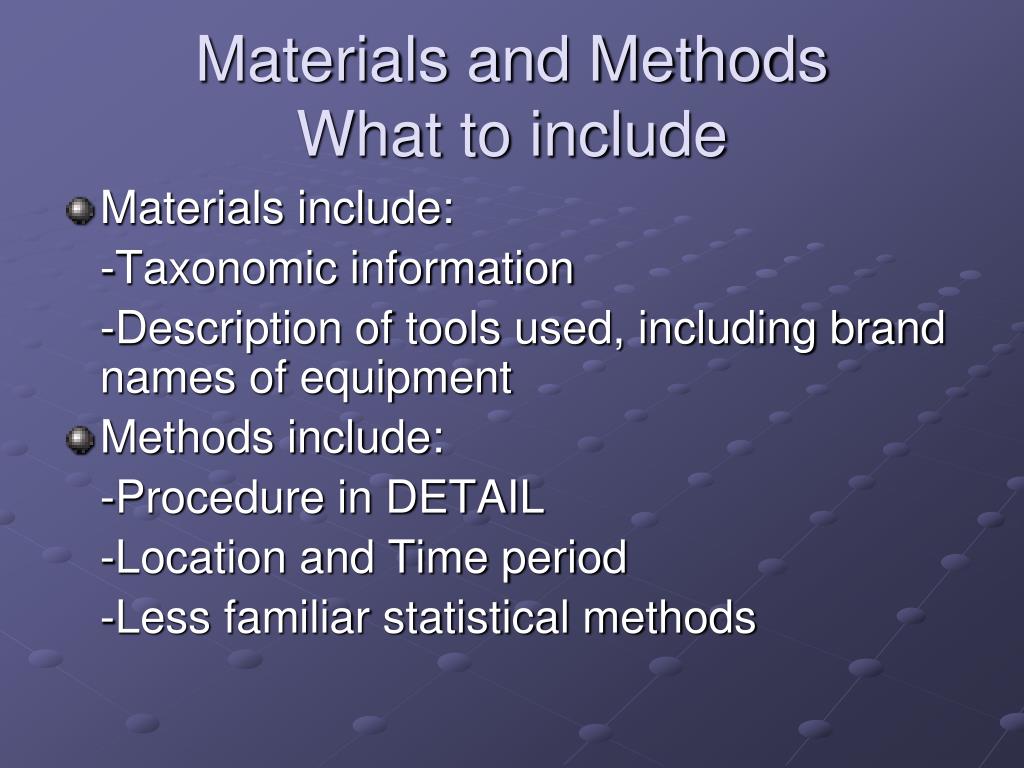Materials and Methods What to include • Materials include: -Taxonomic information -Description of tools used, including brand names of equipment • Methods include: -Procedure in DETAIL -Location and Time period -Less familiar statistical methods