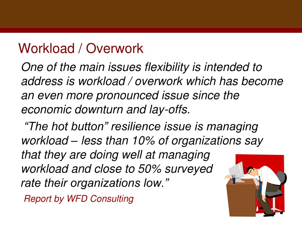 Workload / Overwork One of the main issues flexibility is intended to address is workload / overwork which has become an even more pronounced issue since the economic downturn and lay-offs. “The hot button” resilience issue is managing workload – less than 10% of organizations say that they are doing well at managing workload and close to 50% surveyed rate their organizations low.” Report by WFD Consulting