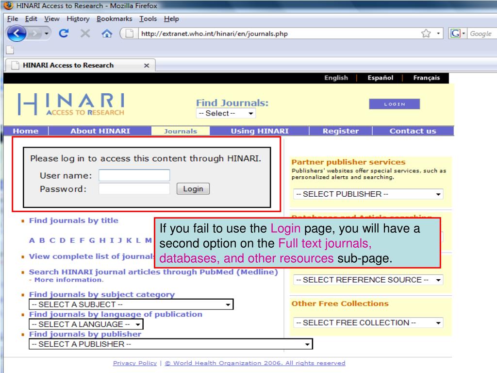 Access problems can be caused by: • failure to properly LOGIN with the institution's User Name/Password • technical problems at the Publisher's website 3) or problems with local systems (configuration of user institution’s firewall, configuration of browser) 4) The publisher has not authorized access – mostly for Band 2 countries Consequently, you may see a message on the Publisher‘ denying access and requesting Sign In or Purchase Short-Term Access. Note: Your HINARI institutional ‘User Name/Password’ will NOT work.