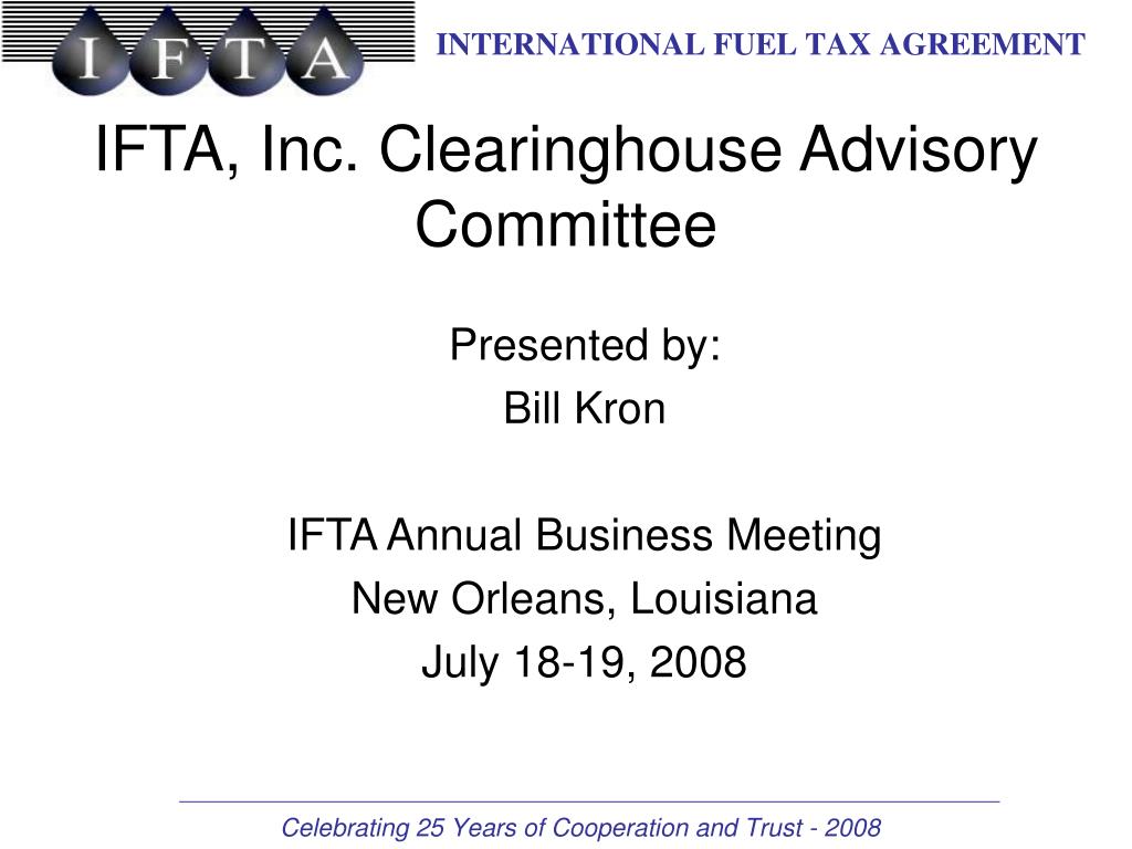 IFTA, Inc. Clearinghouse Advisory Committee Presented by: Bill Kron IFTA Annual Business Meeting New Orleans, Louisiana July 18-19, 2008