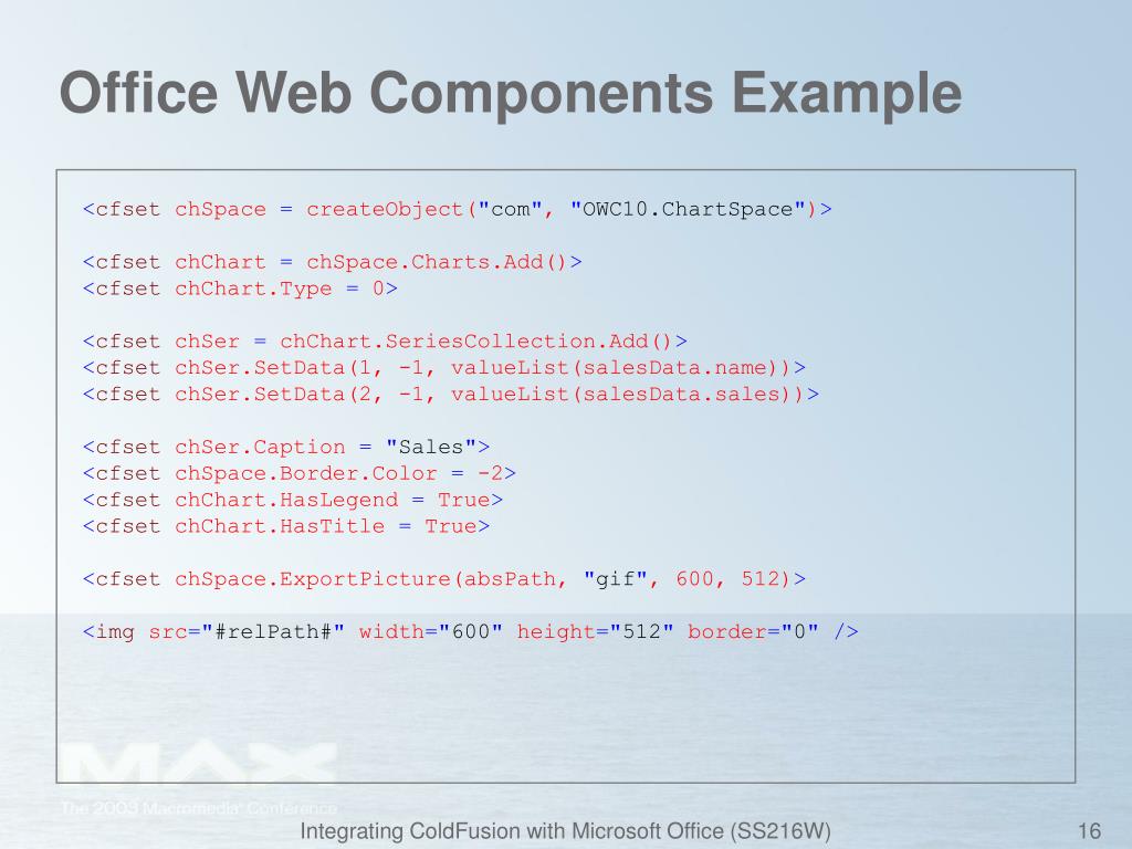 Office Web Components Example <cfset chSpace = createObject("com", "OWC10.ChartSpace")> <cfset chChart = chSpace.Charts.Add()> <cfset chChart.Type = 0> <cfset chSer = chChart.SeriesCollection.Add()> <cfset chSer.SetData(1, -1, valueList(salesData.name))> <cfset chSer.SetData(2, -1, valueList(salesData.sales))> <cfset chSer.Caption ="Sales"> <cfset chSpace.Border.Color = -2> <cfset chChart.HasLegend = True> <cfset chChart.HasTitle = True> <cfset chSpace.ExportPicture(absPath, "gif", 600, 512)> <img src="#relPath#" width="600" height="512" border="0"/> Integrating ColdFusion with Microsoft Office (SS216W)