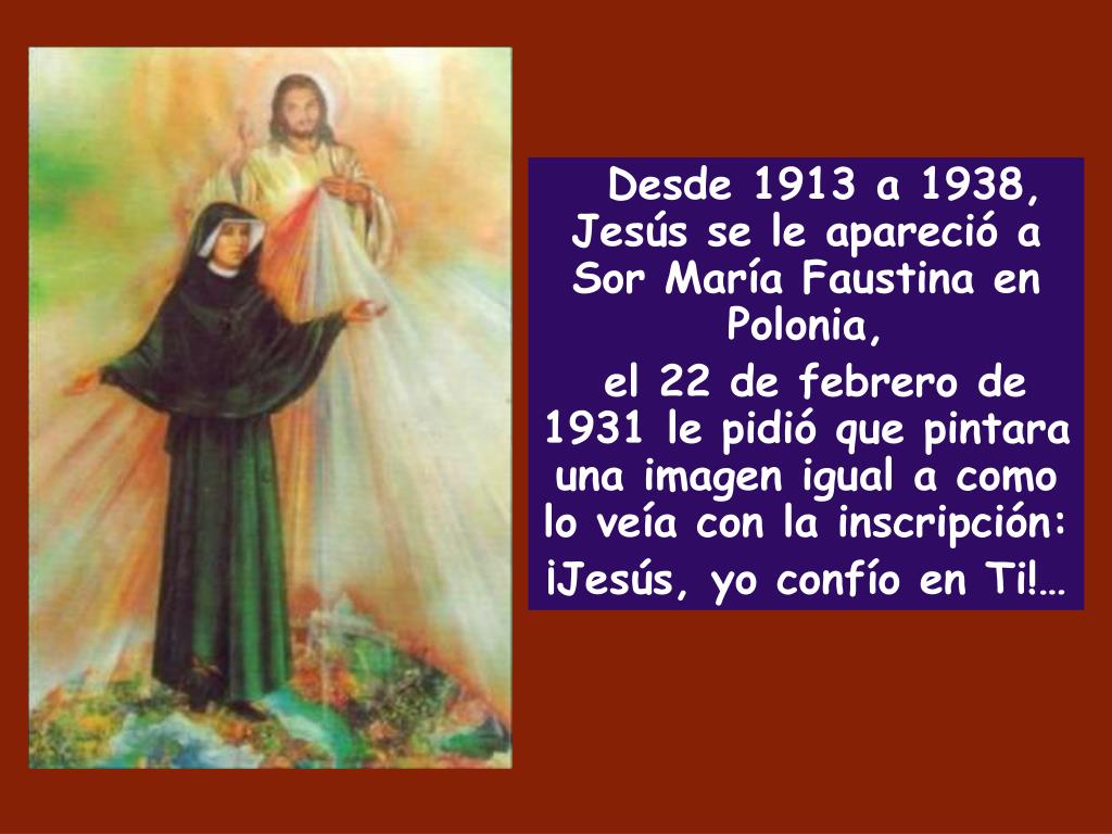 Desde 1913 a 1938, Jesús se le apareció a Sor María Faustina en Polonia, el 22 de febrero de 1931 le pidió que pintara una imagen igual a como lo veía con la inscripción: ¡Jesús, yo confío en Ti!…