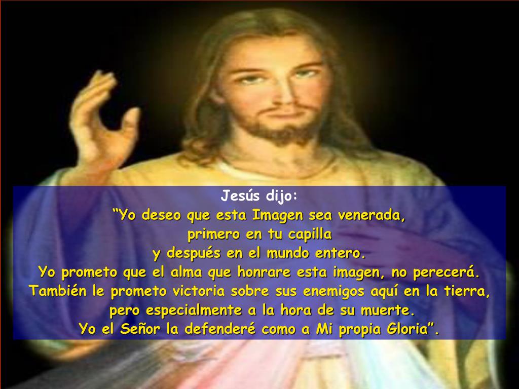 Jesús dijo: “Yo deseo que esta Imagen sea venerada, primero en tu capilla y después en el mundo entero. Yo prometo que el alma que honrare esta imagen, no perecerá. También le prometo victoria sobre sus enemigos aquí en la tierra, pero especialmente a la hora de su muerte. Yo el Señor la defenderé como a Mi propia Gloria”.