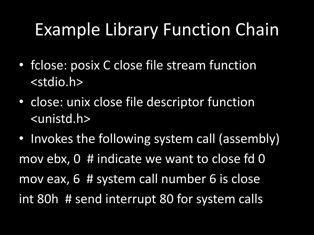Example Library Function Chain • fclose: posix C close file stream function <stdio.h> • close: unix close file descriptor function <unistd.h> • Invokes the following system call (assembly) movebx, 0 # indicate we want to close fd 0 moveax, 6 # system call number 6 is close int 80h # send interrupt 80 for system calls