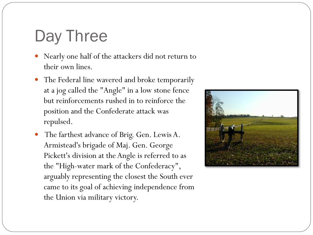 Day Three • Nearly one half of the attackers did not return to their own lines. • The Federal line wavered and broke temporarily at a jog called the "Angle" in a low stone fence but reinforcements rushed in to reinforce the position and the Confederate attack was repulsed. • The farthest advance of Brig. Gen. Lewis A. Armistead's brigade of Maj. Gen. George Pickett's division at the Angle is referred to as the "High-water mark of the Confederacy", arguably representing the closest the South ever came to its goal of achieving independence from the Union via military victory.