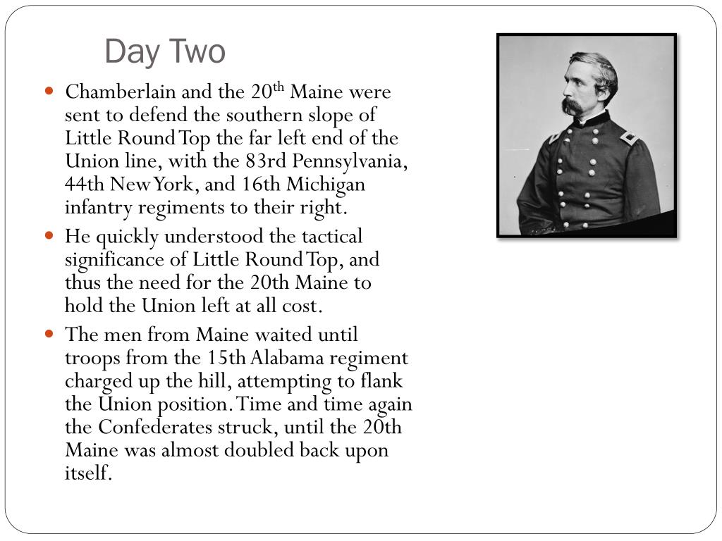 Day Two • Chamberlain and the 20th Maine were sent to defend the southern slope of Little Round Top the far left end of the Union line, with the 83rd Pennsylvania, 44th New York, and 16th Michigan infantry regiments to their right. • He quickly understood the tactical significance of Little Round Top, and thus the need for the 20th Maine to hold the Union left at all cost. • The men from Maine waited until troops from the 15th Alabama regiment charged up the hill, attempting to flank the Union position. Time and time again the Confederates struck, until the 20th Maine was almost doubled back upon itself.