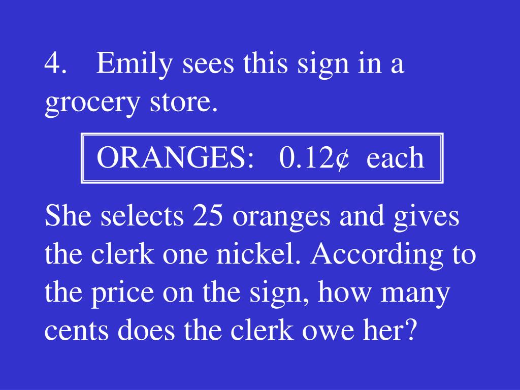 4. Emily sees this sign in a grocery store. She selects 25 oranges and gives the clerk one nickel. According to the price on the sign, how many cents does the clerk owe her? ORANGES: 0.12¢ each