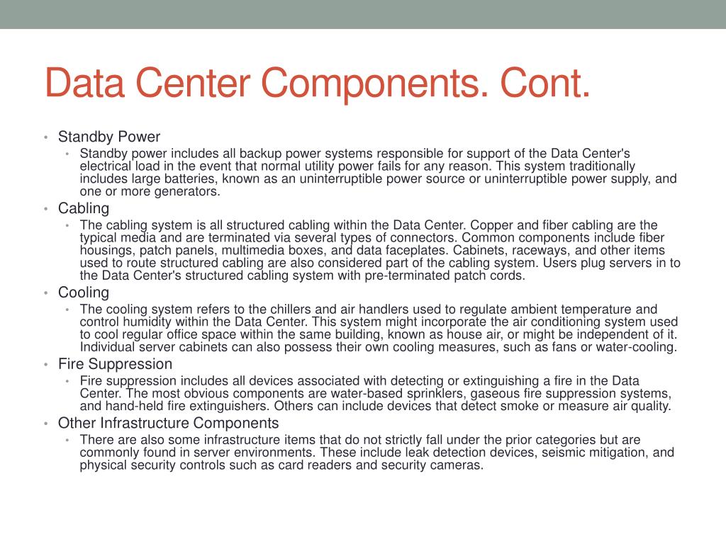 Data Center Components. Cont. • Standby Power • Standby power includes all backup power systems responsible for support of the Data Center's electrical load in the event that normal utility power fails for any reason. This system traditionally includes large batteries, known as an uninterruptible power source or uninterruptible power supply, and one or more generators. • Cabling • The cabling system is all structured cabling within the Data Center. Copper and fiber cabling are the typical media and are terminated via several types of connectors. Common components include fiber housings, patch panels, multimedia boxes, and data faceplates. Cabinets, raceways, and other items used to route structured cabling are also considered part of the cabling system. Users plug servers in to the Data Center's structured cabling system with pre-terminated patch cords. • Cooling • The cooling system refers to the chillers and air handlers used to regulate ambient temperature and control humidity within the Data Center. This system might incorporate the air conditioning system used to cool regular office space within the same building, known as house air, or might be independent of it. Individual server cabinets can also possess their own cooling measures, such as fans or water-cooling. • Fire Suppression • Fire suppression includes all devices associated with detecting or extinguishing a fire in the Data Center. The most obvious components are water-based sprinklers, gaseous fire suppression systems, and hand-held fire extinguishers. Others can include devices that detect smoke or measure air quality. • Other Infrastructure Components • There are also some infrastructure items that do not strictly fall under the prior categories but are commonly found in server environments. These include leak detection devices, seismic mitigation, and physical security controls such as card readers and security cameras.