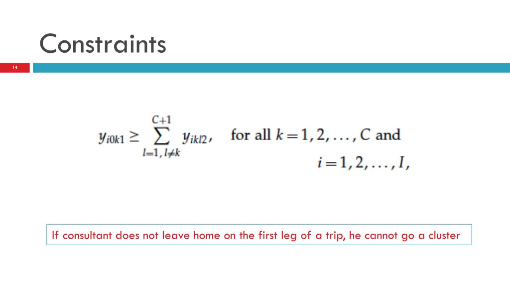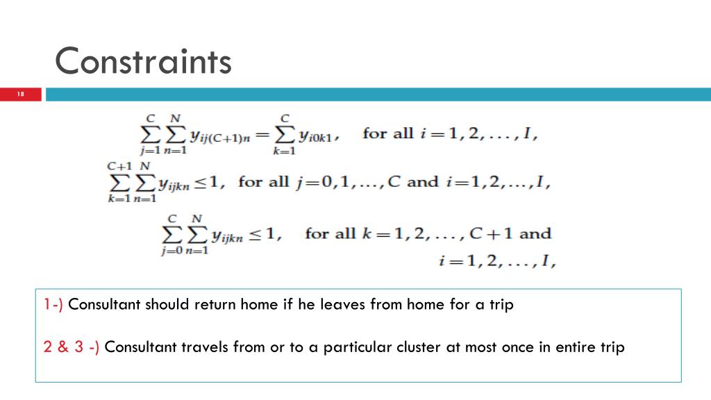 Constraints 1-) Consultant should return home if he leaves from home for a trip 2 & 3 -) Consultant travels from or to a particular cluster at most once in entire trip