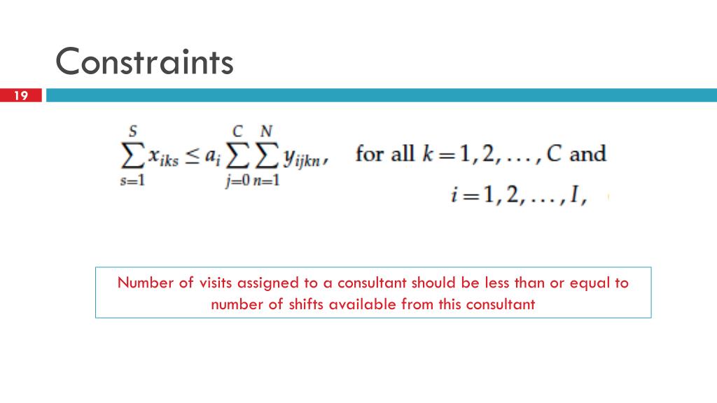 Constraints Number of visits assigned to a consultant should be less than or equal to number of shifts available from this consultant