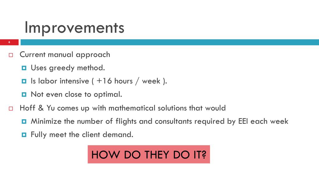 Improvements • Currentmanualapproach • Usesgreedymethod. • Is laborintensive ( +16 hours / week ). • Not evencloseto optimal. • Hoff & Yucomesupwithmathematicalsolutionsthatwould • Minimize thenumber of flightsandconsultantsrequiredby EEI eachweek • Fullymeettheclientdemand. HOW DO THEY DO IT?