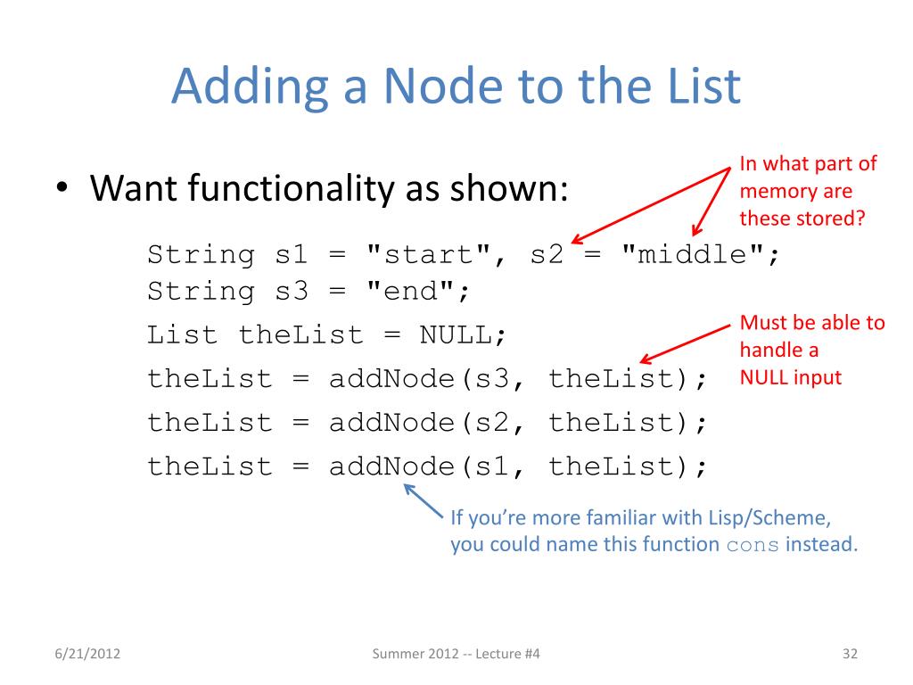 Adding a Node to the List In what part of memory are these stored? • Want functionality as shown: String s1 = "start", s2 = "middle"; String s3 = "end"; List theList = NULL; theList = addNode(s3, theList); theList= addNode(s2, theList); theList= addNode(s1, theList); Must be able to handle a NULL input If you’re more familiar with Lisp/Scheme, you could name this function cons instead. Summer 2012 -- Lecture #4