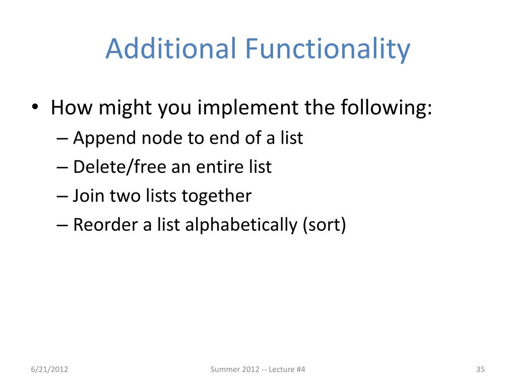 Additional Functionality • How might you implement the following: • Append node to end of a list • Delete/free an entire list • Join two lists together • Reorder a list alphabetically (sort) Summer 2012 -- Lecture #4