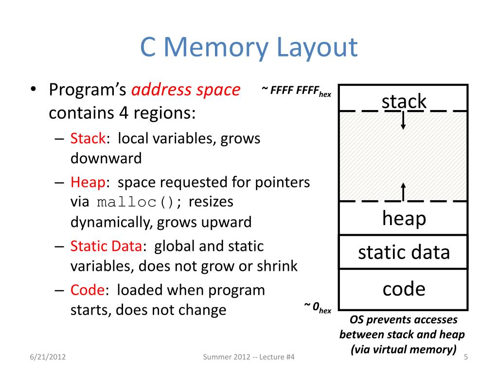 C Memory Layout ~ FFFF FFFFhex stack • Program’s address spacecontains 4 regions: • Stack: local variables, grows downward • Heap: space requested for pointers via malloc(); resizes dynamically, grows upward • Static Data: global and static variables, does not grow or shrink • Code: loaded when program starts, does not change heap static data code ~ 0hex OS prevents accessesbetween stack and heap (via virtual memory) Summer 2012 -- Lecture #4