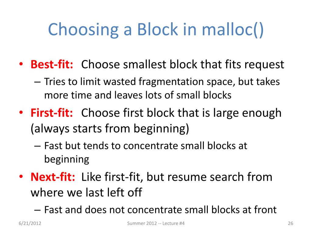 Choosing a Block in malloc() • Best-fit: Choose smallest block that fits request • Tries to limit wasted fragmentation space, but takes more time and leaves lots of small blocks • First-fit: Choose first block that is large enough (always starts from beginning) • Fast but tends to concentrate small blocks at beginning • Next-fit: Like first-fit, but resume search from where we last left off • Fast and does not concentrate small blocks at front Summer 2012 -- Lecture #4