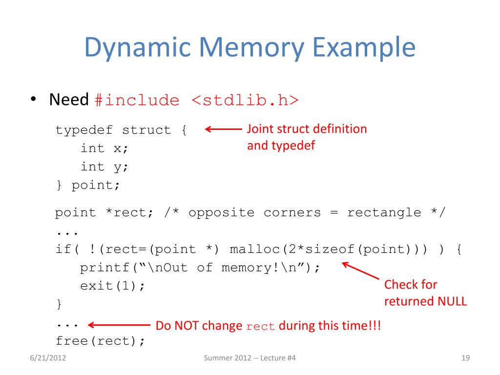 Dynamic Memory Example • Need #include <stdlib.h> typedefstruct { int x; int y; } point; point *rect; /* opposite corners = rectangle */ ... if( !(rect=(point *) malloc(2*sizeof(point))) ) { printf(“\nOut of memory!\n”); exit(1); } ... free(rect); Joint struct definition and typedef Check for returned NULL Do NOT change rect during this time!!! Summer 2012 -- Lecture #4