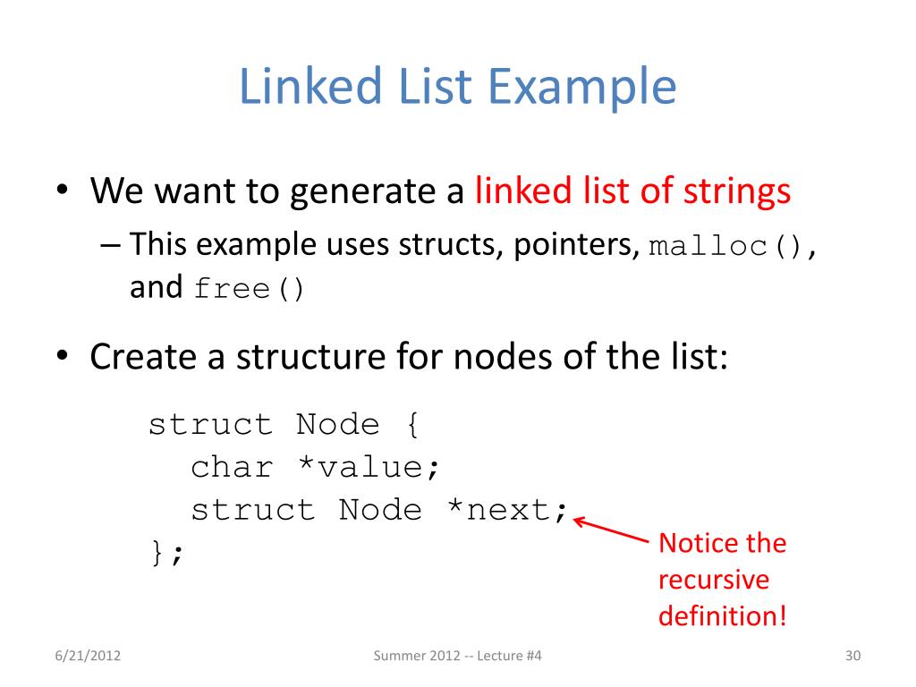 Linked List Example • We want to generate a linked list of strings • This example uses structs, pointers, malloc(), and free() • Create a structure for nodes of the list: struct Node { char *value; struct Node *next; }; Notice the recursive definition! Summer 2012 -- Lecture #4