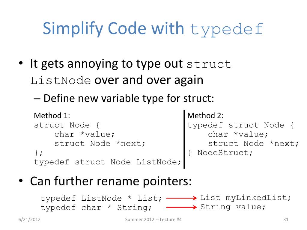 Simplify Code with typedef • It gets annoying to type out structListNode over and over again • Define new variable type for struct: Method 1:Method 2: • Can further rename pointers: typedefListNode * List; typedefchar * String; struct Node { char *value; struct Node *next;}; typedefstruct Node ListNode; typedefstruct Node { char *value; struct Node *next;} NodeStruct; List myLinkedList; String value; Summer 2012 -- Lecture #4