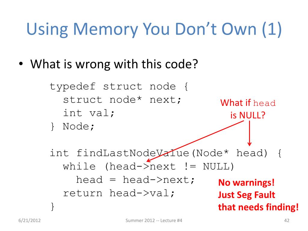 Using Memory You Don’t Own (1) • What is wrong with this code? typedefstruct node { struct node* next; intval; } Node; intfindLastNodeValue(Node* head) { while (head->next != NULL) head = head->next; return head->val; } What if headis NULL? No warnings! Just Seg Faultthat needs finding! Summer 2012 -- Lecture #4