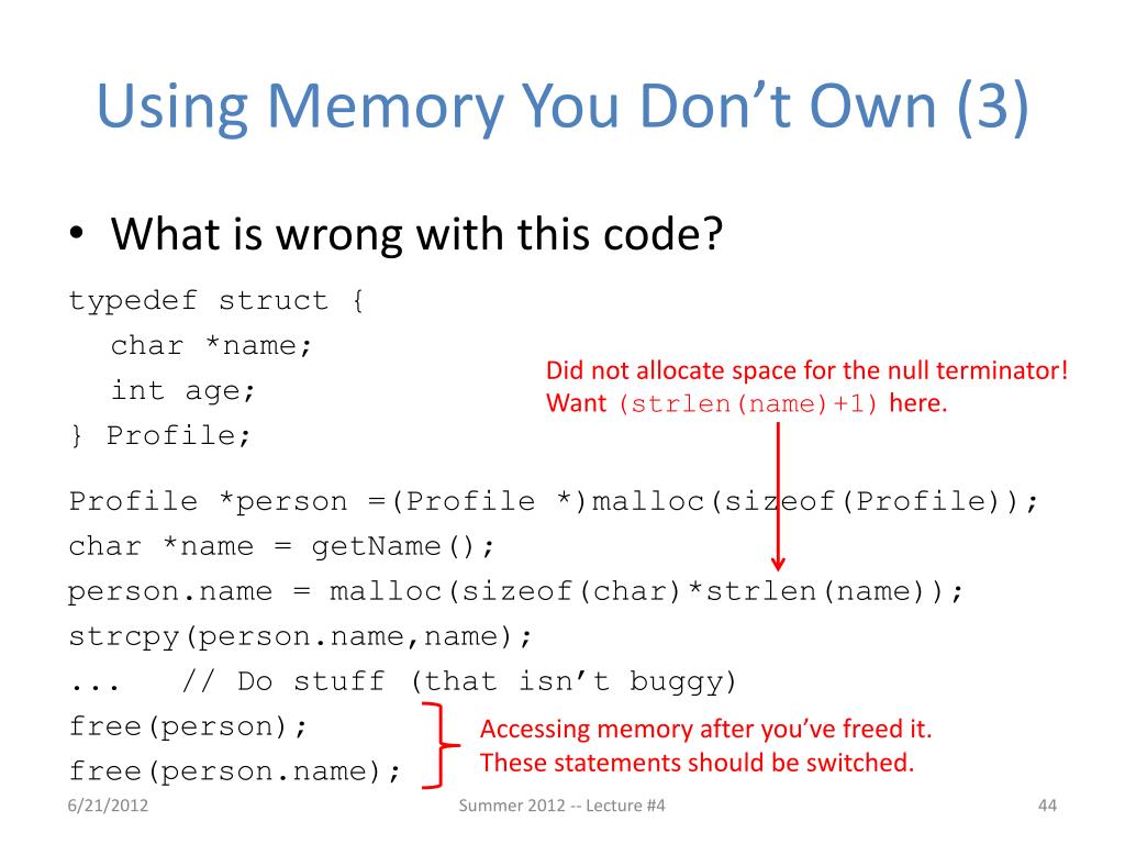 Using Memory You Don’t Own (3) • What is wrong with this code? typedefstruct { char *name; int age; } Profile; Profile *person =(Profile *)malloc(sizeof(Profile)); char *name = getName(); person.name = malloc(sizeof(char)*strlen(name)); strcpy(person.name,name); ... // Do stuff (that isn’t buggy) free(person); free(person.name); Did not allocate space for the null terminator! Want (strlen(name)+1) here. Accessing memory after you’ve freed it. These statements should be switched. Summer 2012 -- Lecture #4