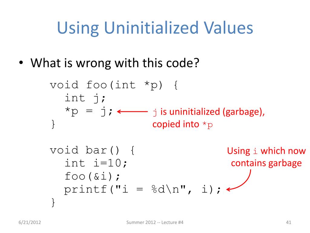 Using Uninitialized Values • What is wrong with this code? void foo(int *p) { int j; *p = j; } void bar() { inti=10; foo(&i); printf("i = %d\n", i); } j is uninitialized (garbage), copied into *p Using i which now contains garbage Summer 2012 -- Lecture #4
