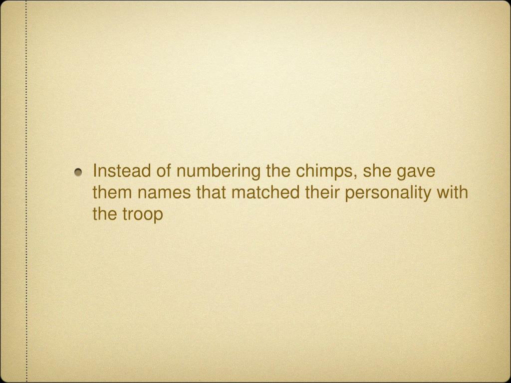 Instead of numbering the chimps, she gave them names that matched their personality with the troop