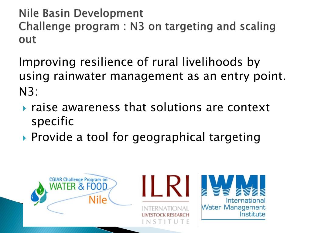 Nile Basin Development Challenge program : N3 on targeting and scaling out Improving resilience of rural livelihoods by using rainwater management as an entry point. N3: • raise awareness that solutions are context specific • Provide a tool for geographical targeting