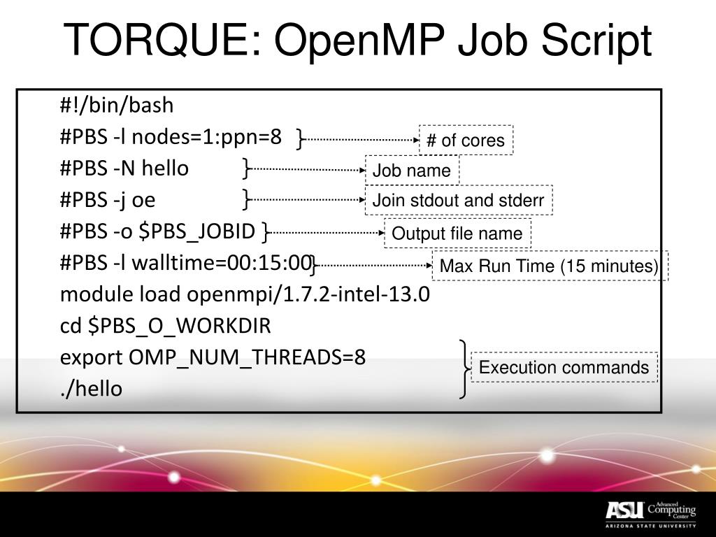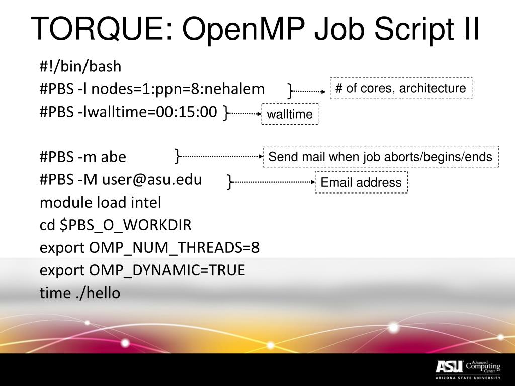 TORQUE: OpenMP Job Script II Send mail when job aborts/begins/ends Email address # of cores, architecture walltime #!/bin/bash #PBS -l nodes=1:ppn=8:nehalem #PBS -lwalltime=00:15:00 #PBS -m abe #PBS -M user@asu.edu module load intel cd $PBS_O_WORKDIR export OMP_NUM_THREADS=8 export OMP_DYNAMIC=TRUE time ./hello