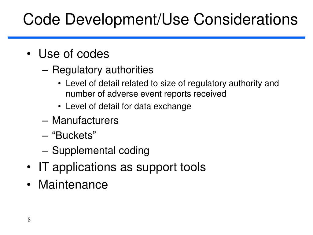 Use of codes Regulatory authorities Level of detail related to size of regulatory authority and number of adverse event reports received Level of detail for data exchange Manufacturers “Buckets” Supplemental coding IT applications as support tools Maintenance Code Development/Use Considerations