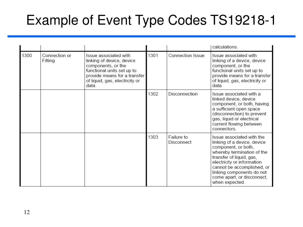 NWIP approved 2000 Background information gathered early 2002 ISO/TC 210 WG 3, concluded that work should result in a Technical Specification WD Prepared mid 2002 Consulted with GHTF SG2 in 2003 DTS Voted on early 2004 and revised As result of preparing DTS2, WG3 concluded NWIP for introduction of hierarchical structure should be proposed DTS 2 Voted on, revised and published as TS 19218:2005 NWIP for hierarchical structure approved 2005 WG3 Decided to split into 2 Documents, Event Type Codes(-1) and Evaluation Codes(-2) 19218-1 Event Type Codes submitted for publication 2010 Amendment 1 to 19218-1 coding examples under development WG3 will review draft of 10218-2 in 2011 with publication in 2012 History of TS 19218
