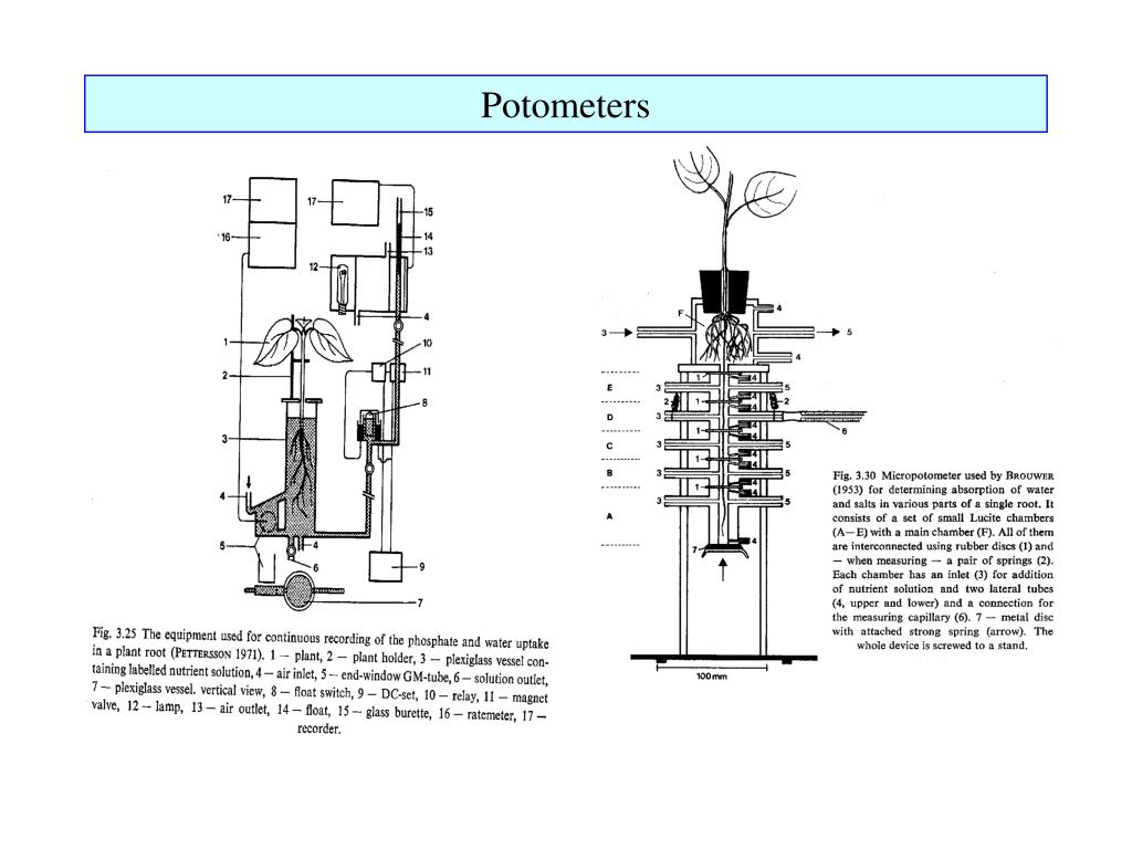 Methods • 1) Gravimetric methods • a) determination of water absoption and transpiration in laboratory conditions • b) determination of water consumption in field conditions - lysimeters (under sufficient water supply they are also used for determination of evapotranspiration of artificial or natural stands) • 2) Measurement of water uptake by potometers • a) for whole root system • b) for individual parts • 3) Measurement of root pressure • a) determination of amount bleeding sap after shoot excision • b) by pressure probe