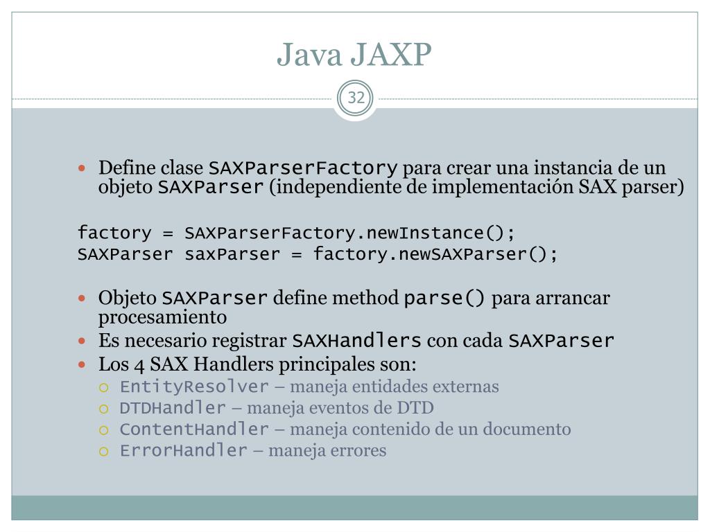 Java JAXP • Define clase SAXParserFactory para crear una instancia de un objeto SAXParser (independiente de implementación SAX parser) factory = SAXParserFactory.newInstance(); SAXParser saxParser = factory.newSAXParser(); • Objeto SAXParser define method parse() para arrancar procesamiento • Es necesario registrar SAXHandlers con cada SAXParser • Los 4 SAX Handlers principales son: • EntityResolver – maneja entidades externas • DTDHandler – maneja eventos de DTD • ContentHandler – maneja contenido de un documento • ErrorHandler – maneja errores