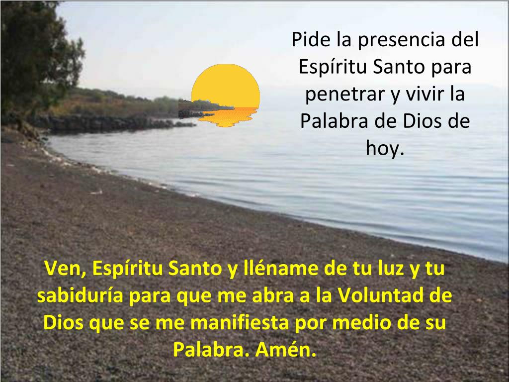 Pide la presencia del Espíritu Santo para penetrar y vivir la Palabra de Dios de hoy. Ven, Espíritu Santo y lléname de tu luz y tu sabiduría para que me abra a la Voluntad de Dios que se me manifiesta por medio de su Palabra. Amén.