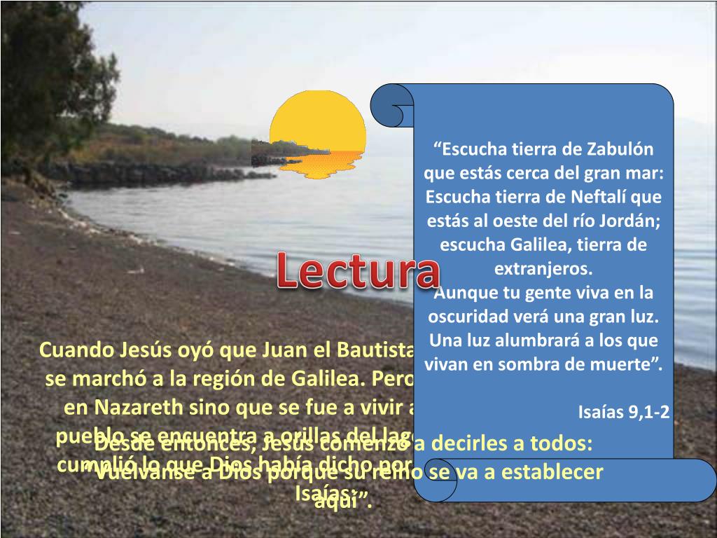 “Escucha tierra de Zabulón que estás cerca del gran mar: Escucha tierra de Neftalí que estás al oeste del río Jordán; escucha Galilea, tierra de extranjeros. Aunque tu gente viva en la oscuridad verá una gran luz. Una luz alumbrará a los que vivan en sombra de muerte”. Isaías 9,1-2 Lectura Cuando Jesús oyó que Juan el Bautista estaba en la cárcel, se marchó a la región de Galilea. Pero no volvió a su casa en Nazareth sino que se fue a vivir a Cafarnaúm. Este pueblo se encuentra a orillas del lago de Galilea. Así se cumplió lo que Dios había dicho por medio del profeta Isaías: Desde entonces, Jesús comenzó a decirles a todos: “Vuélvanse a Dios porque su reino se va a establecer aquí”.