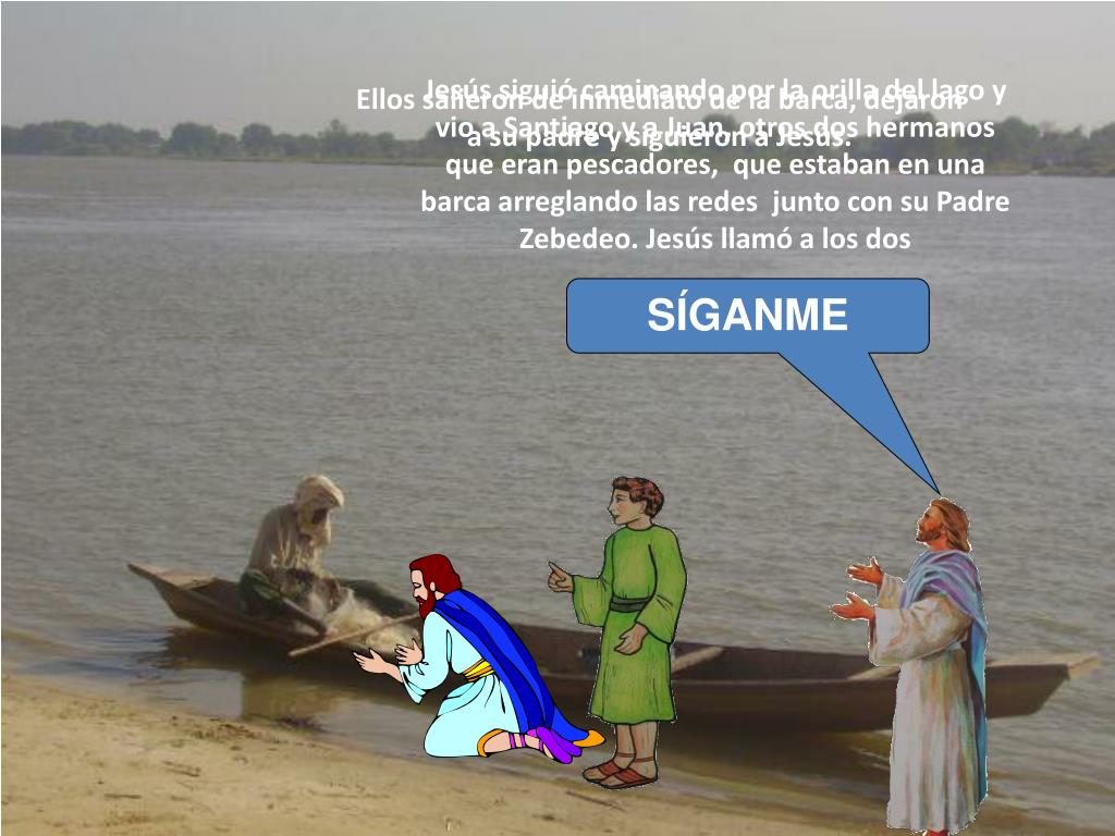 Jesús siguió caminando por la orilla del lago y vio a Santiago y a Juan, otros dos hermanos que eran pescadores, que estaban en una barca arreglando las redes junto con su Padre Zebedeo. Jesús llamó a los dos Ellos salieron de inmediato de la barca, dejaron a su padre y siguieron a Jesús. SÍGANME
