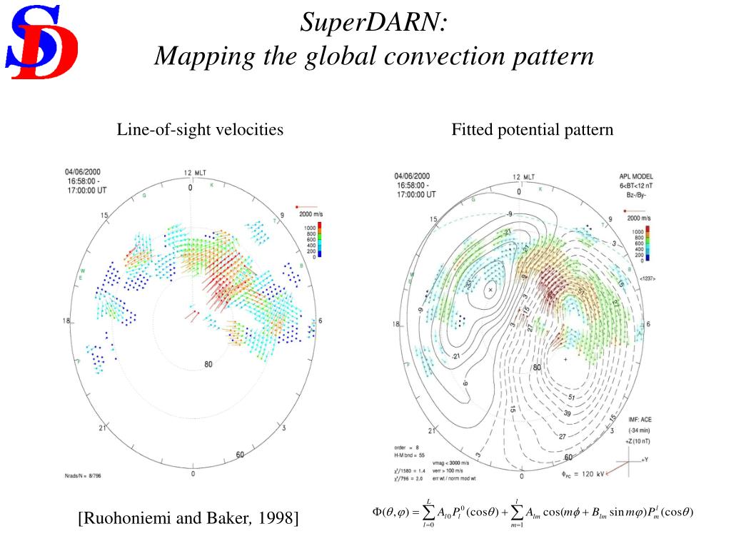 SuperDARN: Mapping the global convection pattern Line-of-sight velocities Fitted potential pattern • [Ruohoniemi and Baker, 1998]