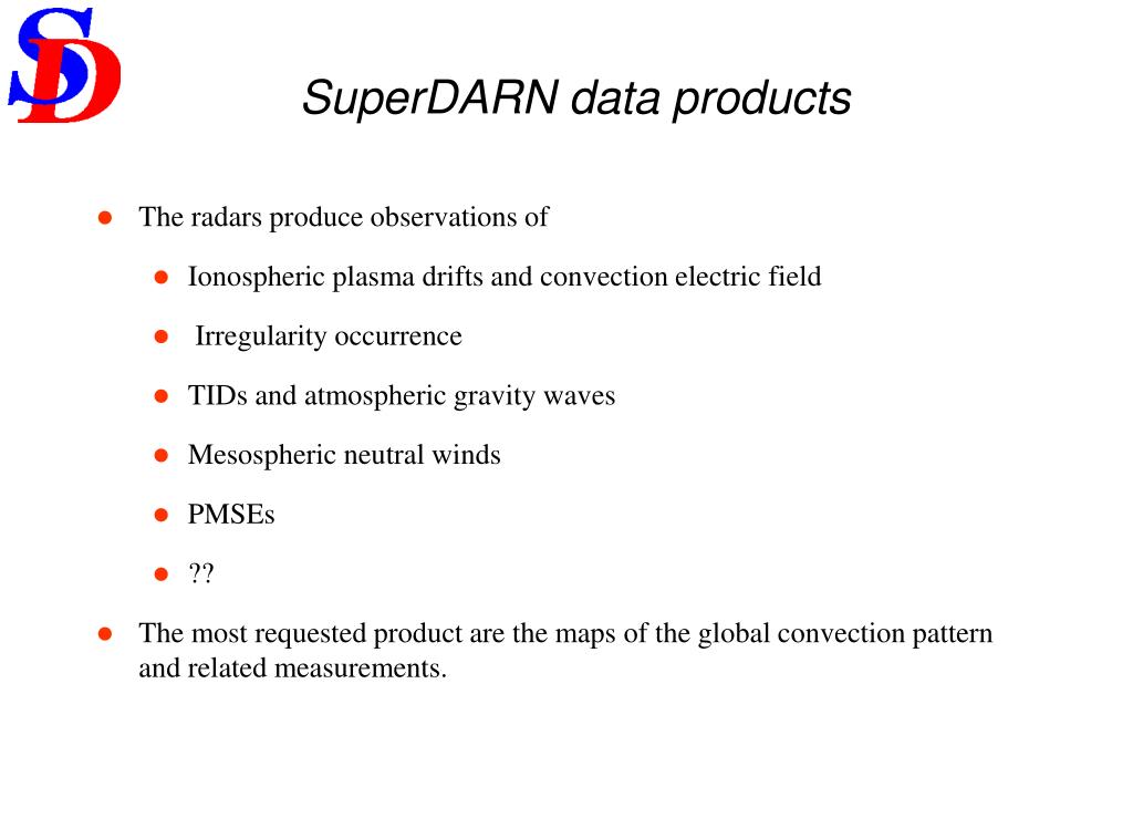 SuperDARN data products • The radars produce observations of • Ionospheric plasma drifts and convection electric field • Irregularity occurrence • TIDs and atmospheric gravity waves • Mesospheric neutral winds • PMSEs • ?? • The most requested product are the maps of the global convection pattern and related measurements.