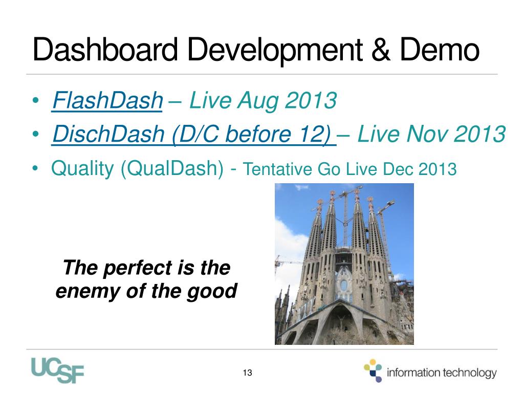 Dashboard Development & Demo • FlashDash – Live Aug 2013 • DischDash (D/C before 12) – Live Nov 2013 • Quality (QualDash) - Tentative Go Live Dec 2013 The perfect is the enemy of the good