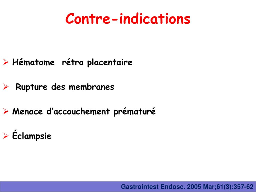 Contre-indications • Hématome rétro placentaire • Rupture des membranes • Menace d’accouchement prématuré • Éclampsie GastrointestEndosc. 2005 Mar;61(3):357-62