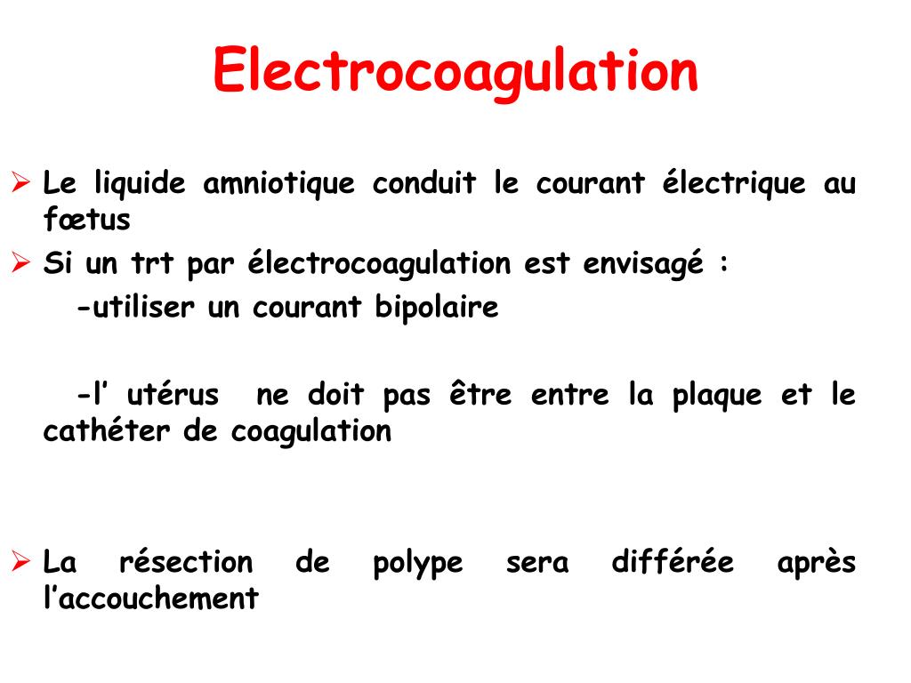 Electrocoagulation • Le liquide amniotique conduit le courant électrique au fœtus • Si un trt par électrocoagulation est envisagé : -utiliser un courant bipolaire -l’ utérus ne doit pas être entre la plaque et le cathéter de coagulation • La résection de polype sera différée après l’accouchement
