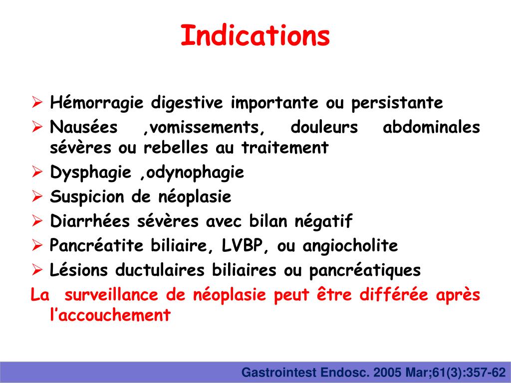 Indications • Hémorragie digestive importante ou persistante • Nausées ,vomissements, douleurs abdominales sévères ou rebelles au traitement • Dysphagie ,odynophagie • Suspicion de néoplasie • Diarrhées sévères avec bilan négatif • Pancréatite biliaire, LVBP, ou angiocholite • Lésions ductulaires biliaires ou pancréatiques La surveillance de néoplasie peut être différée après l’accouchement GastrointestEndosc. 2005 Mar;61(3):357-62
