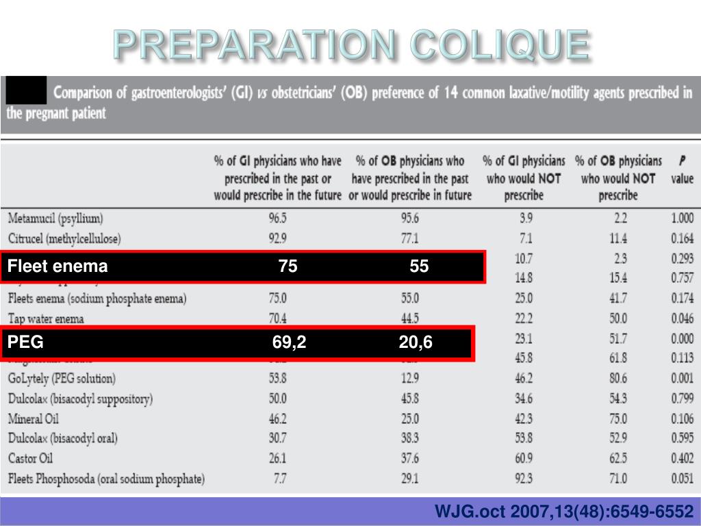 Préparation colique • Lorsque l’ indication d’endoscopie digestive basse est posée, le clinicien est confronté au choix de la préparation colique • Ce choix devientdifficile devant les nombreux produits pharmacologiques et l’absence de donnéessuffisantes dans la littérature • Il se base sur l’innocuité du produit pour Mère/fœtus et la qualité de la préparation obtenue WJG.oct 2007,13(48):6549-6552