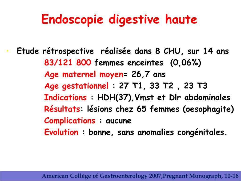 Au terme de ces études, il a été conclu : La FOGD et l’endoscopie digestive basse ,notamment la RSS , réalisées chez la femme enceinte ne comportent pas de risque spécifique chez la mère et le fœtus , lorsque leurs indications sont appropriées Gastrointestendosc 2005 Mar ; 61(3):357-362