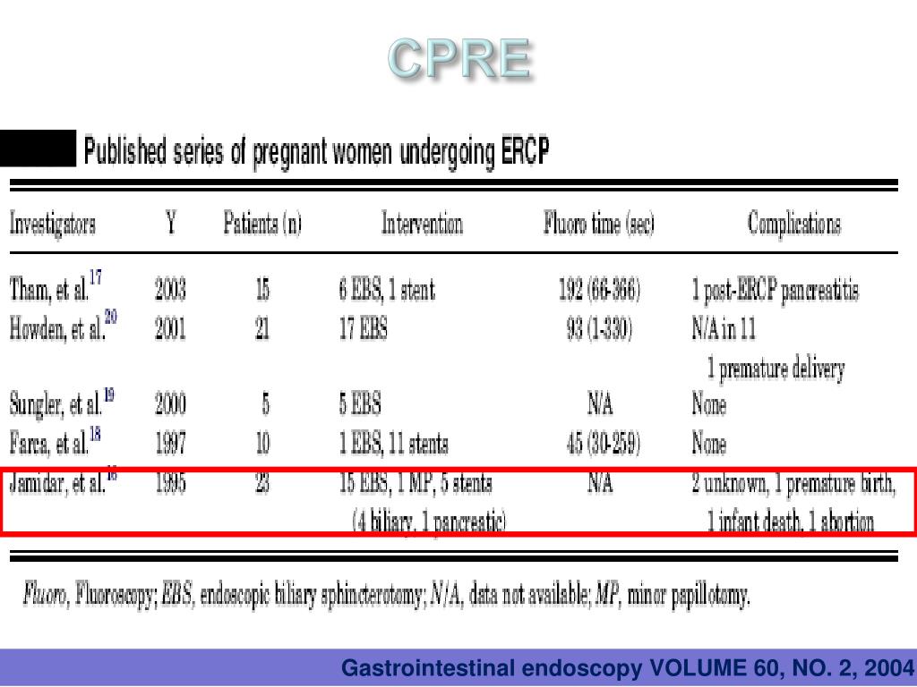 CPRE • CPRE sans radiations chez 21 femmes enceinte • Cannulation sous fil guide • L’extraction des calculs s’est déroulée sans incidents • 1 cas de pancréatite post-CPRE • Cette étude est prometteuse • le tps de radiation ne doit pas être long • leur dose ne doit pas excéder 100 mrem • un tablier de plomb doit être interposé sous le bas ventre et le pelvis Gastrointestinalendoscopy .2008 Feb;67(2):364 - 8